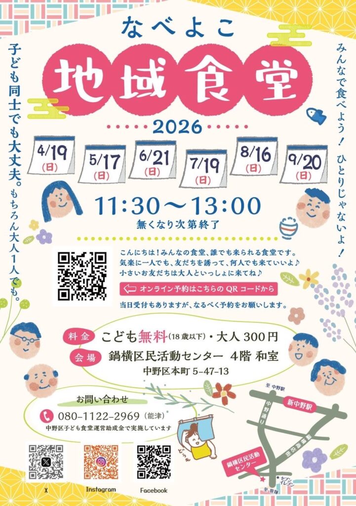 毎月第3日曜日(11:30〜13:00)に鍋横区民活動センター4階(テーブル席、和室席あり)で実施しているなべよこ地域食堂。