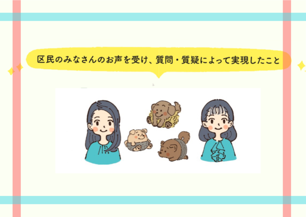 今回の区政レポート発行に当たり、これまで区民のみなさんのお声を受けて質疑・質問したことで実際に「実現したこと」を一部まとめました。