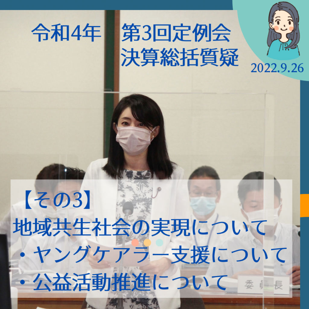 令和4年9月26日の決算特別委員会総括質疑のつづきです。 通告内容はこちらです。 動画で見たい方はこちら▷▷▷【中継動画】 3.地域共生社会の実現…