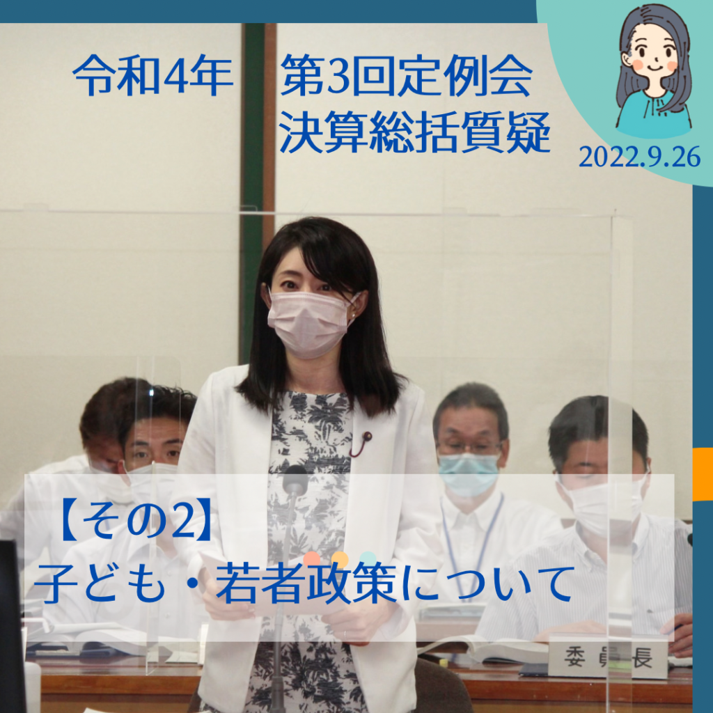 令和4年9月26日の決算特別委員会総括質疑のつづきです。 通告内容はこちらです。 動画で見たい方はこちら▷▷▷【中継動画】 2.子ども・若者政策に…
